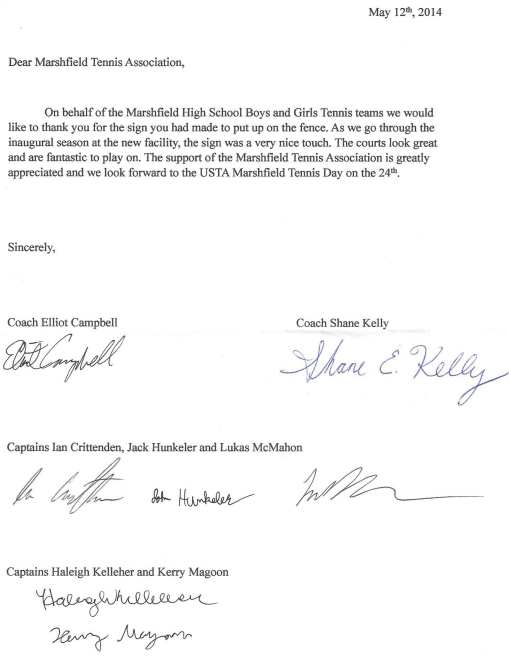 The Marshfield Tennis Club recently donated a sign to commemorate the opening of the new Marshfield High School Tennis courts. The Marshfield Tennis Club would like to wish Coach Campbell & Coach Kelly the best of luck this season.